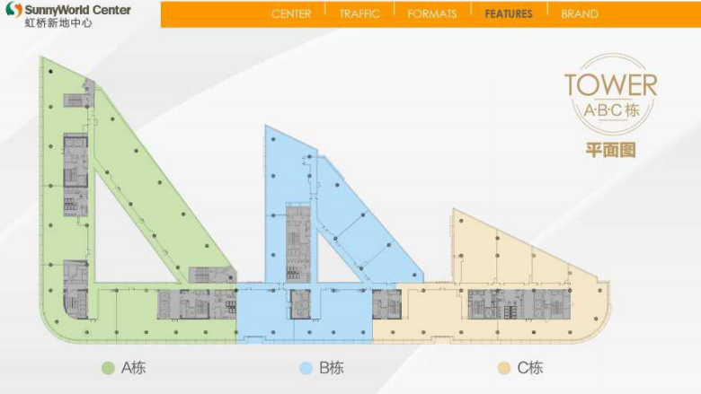 三、项目:虹桥新地中心是新地集团在上海打造的写字楼项目,国际大师级绿色生态景观超甲写字楼。写字楼建筑面积约5.2万方,商铺建筑面积1.2万方,共有四栋(ABCD)联体商业组成。拥有商业物业管理企业,商业开发与运营经验28载,服务标准对话全球。