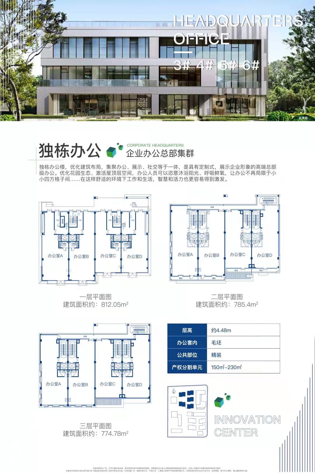 独栋办公楼共2.3万㎡,共10栋,每栋三层,整栋建面约1600-2800㎡,4.48米层高,每栋9-12个产证(分割面积150-200㎡/套),每套独立卫生间。