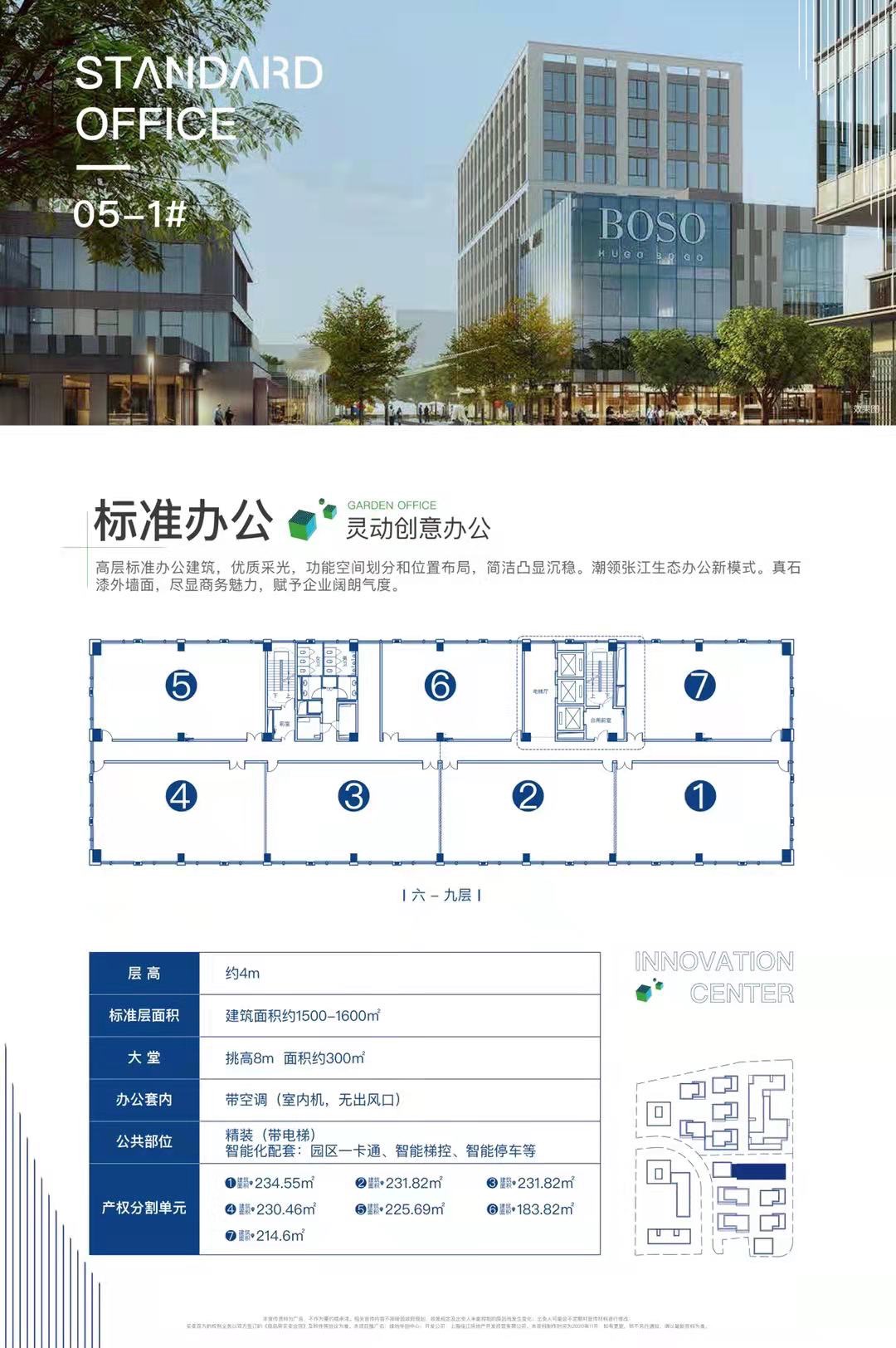 高层办公共1.6万㎡:1.5栋可售,九层,大堂挑高8米,标准层高4米,产权分割面积约150-200㎡。