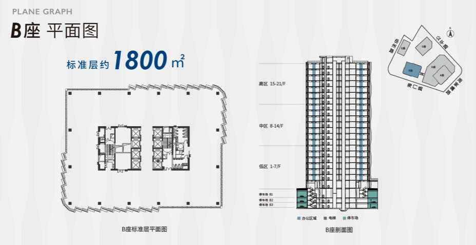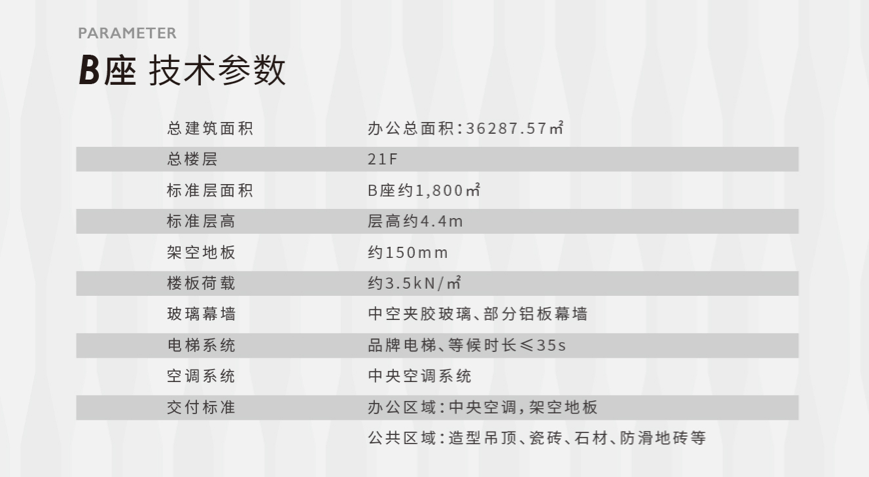 B栋(总高21层、20本产证),整栋面积:36287.57平米(办公2-21F),整层面积:约1393-1838平米,均价7.2万/平米,整层1.2亿、整栋26亿