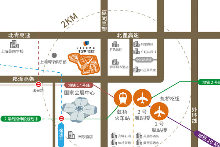 项目紧邻17号线地铁诸光路站,2km直达虹桥枢纽,交通纵横通达长三角。
