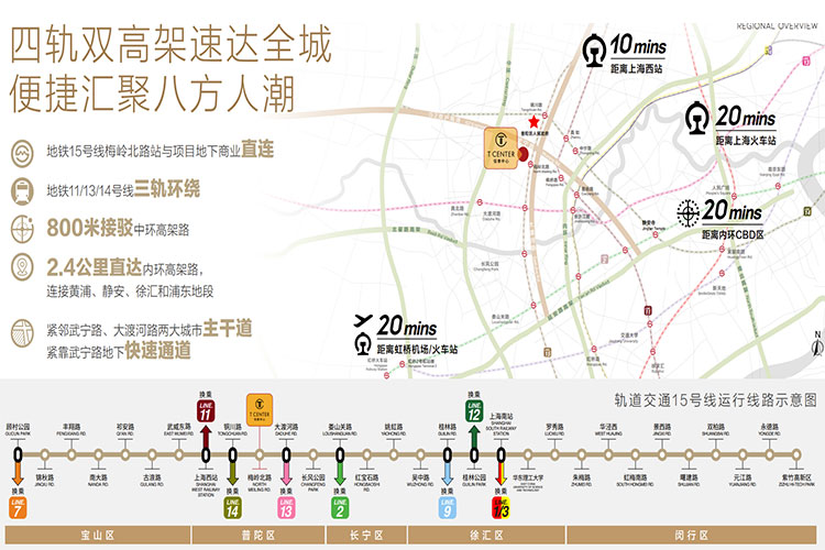 项目作为地铁15号线梅岭北路站上盖,周边还有3条轨道交通环绕(11、13、14号线)。项目离中环高架约800米,同时还邻近内环高架路约2公里,可快速通达黄浦、静安、浦东和徐汇等区域;紧邻武宁路、大渡河路两大城市主干道;紧靠全新通车的武宁路地下快速通道,是连通城市活力和产业发展的重要纽带,出行交通便捷。