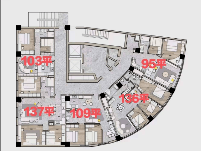 四、出售:现房不限购,共14层,在售8楼和14楼,层高3米,户型朝北-朝东,户型面积95、103、109、136、137平米,报价49800元/平起,总价约475万-750万
