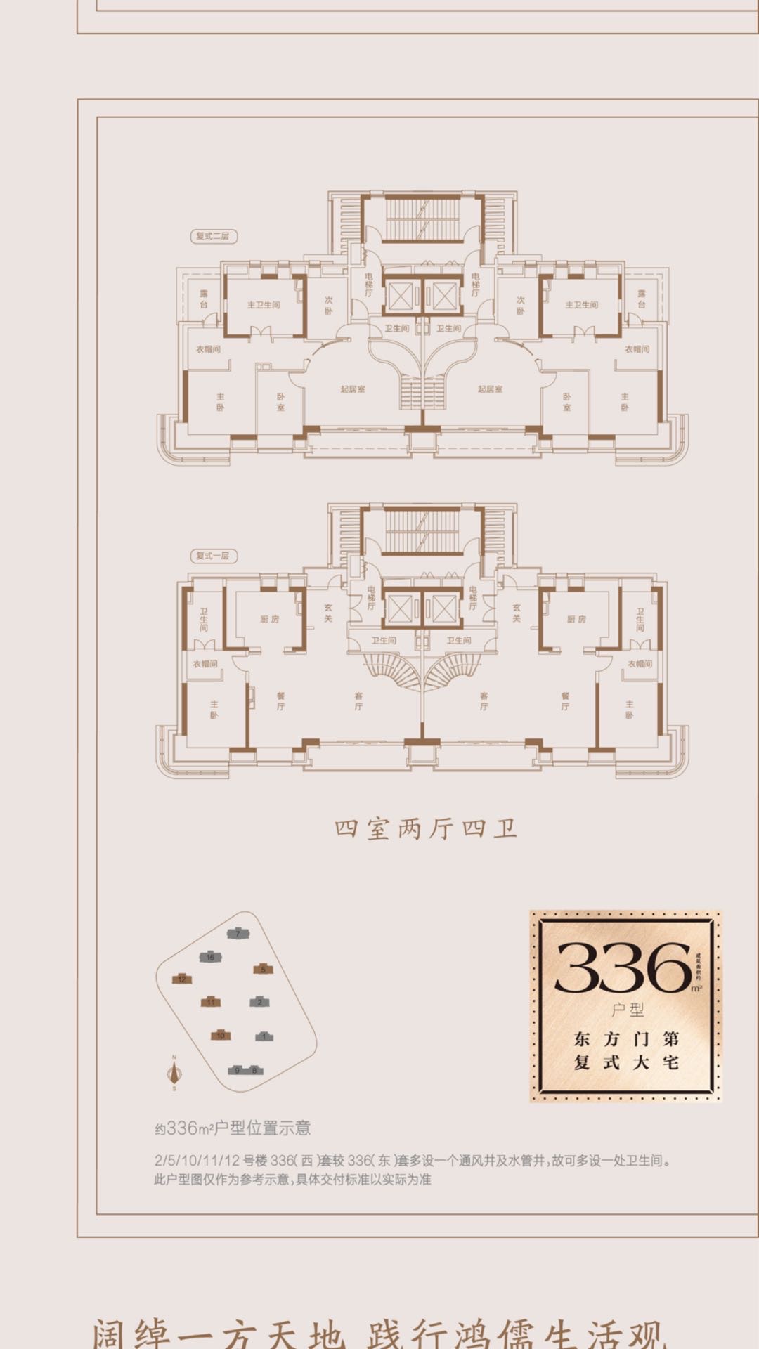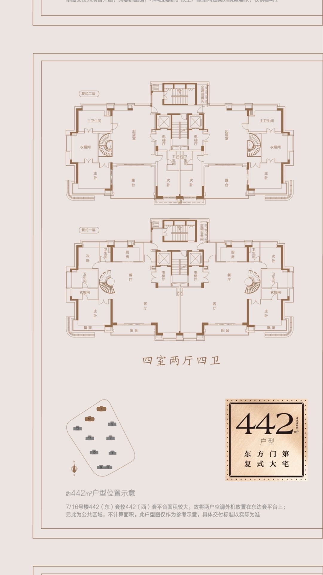 三、销售:在售住宅总高:24层(一梯一户),面积:336平-442平(顶楼复式房源),均价10.5万左右,总价3950-5219万左右