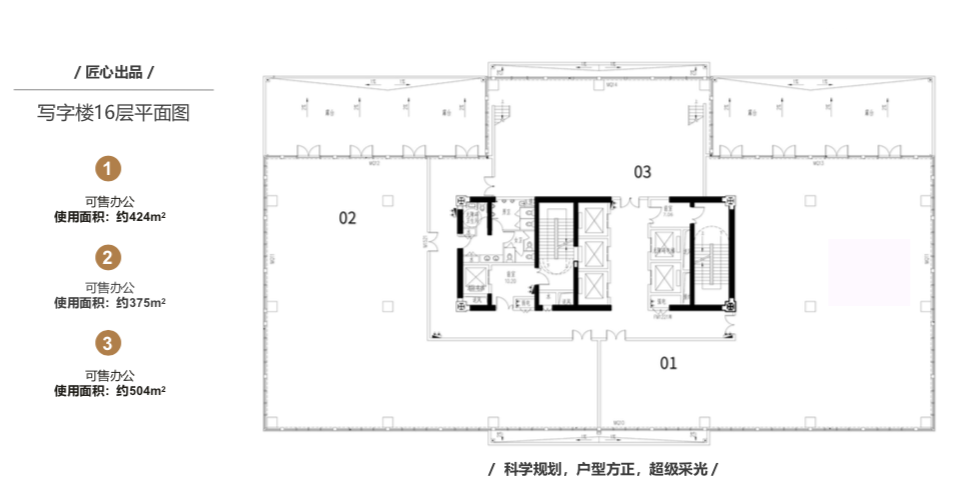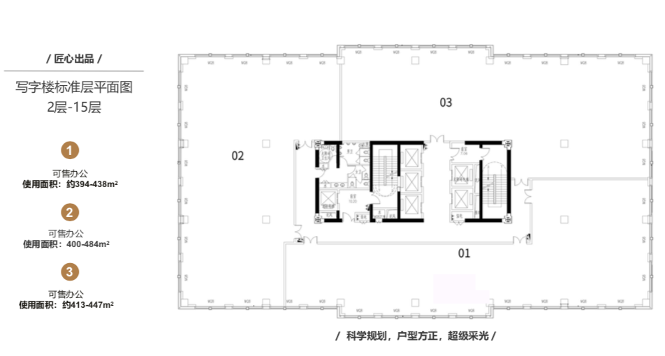 四、销售:1号楼、5号楼两栋18层标准办公楼,每栋5部电梯、大堂挑高7.2米,标准层高4.2米,整层约1600㎡,单套约500-550㎡可分割,单价45000元/㎡~50000元/平米