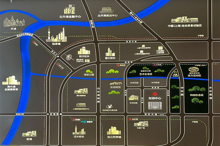 东郊商办是上海内环旁、中环内的总部商办用地项目。东郊版块是上海的豪宅、别墅集聚区,南临龙阳路,东靠金桥路,借助龙东大道与金桥路的干道便捷,临近张江高科园与金桥开发区这2大产业基地,人群、精英客层积聚,将打造成一个以金融业为引导的花园企业总部项目,私密度高,低密、高绿化,共享空间。配套商业有商务中餐厅、顶级SPA、健身会所、米其林餐厅、商务会议、有机超市等,既满足了项目内人员的生活、休闲需求,亦弥补了金桥与张江间无消费场所的遗憾。