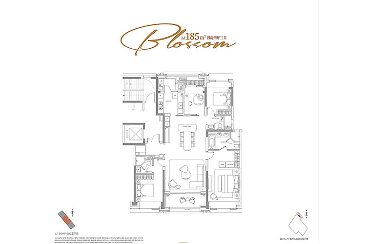 185㎡:飞机户型双套房,2梯2户私享电梯厅,LDKB一体化,全飘窗设计,主卧配步入式衣帽间及双台盆+浴缸主卫